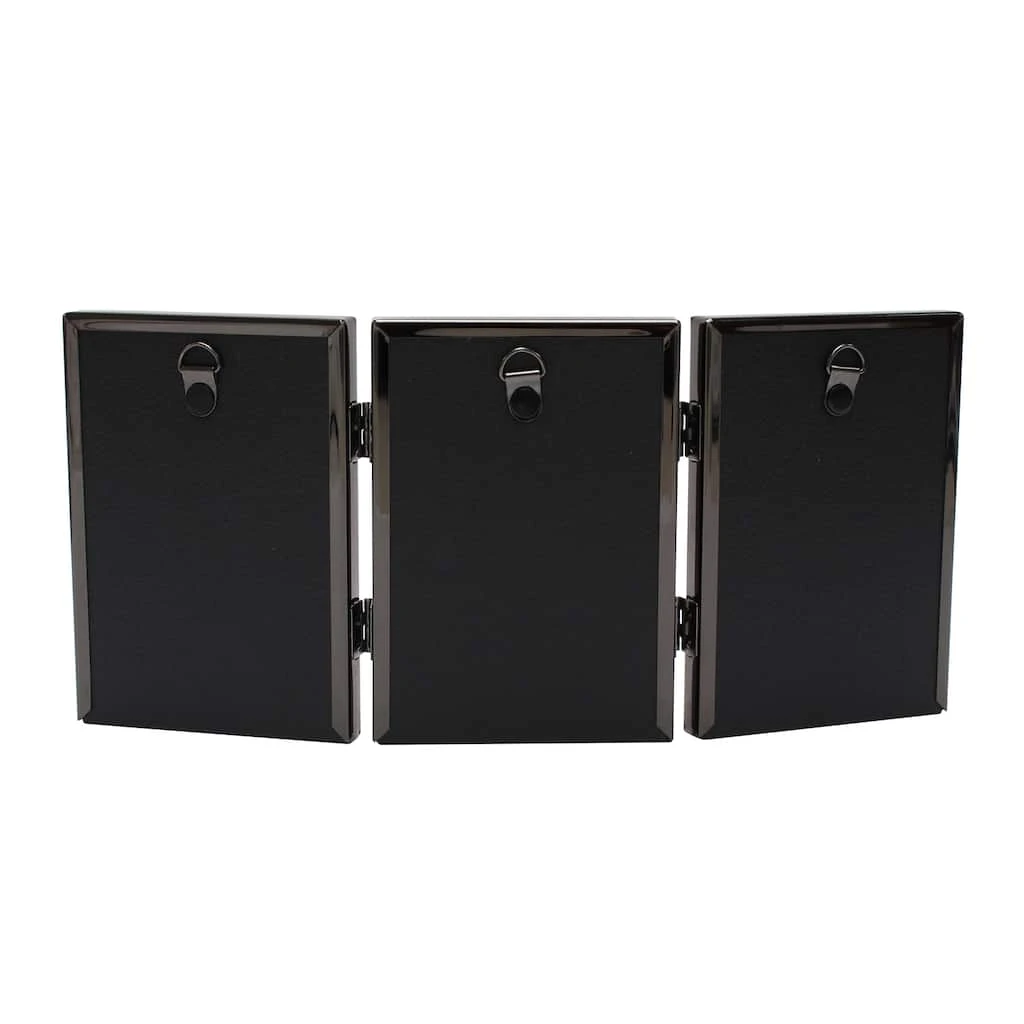 Proudly display a trio of family photographs. Three metal frames are hinged together to create an eye-catching photo arrangement for your desk or tabletop.