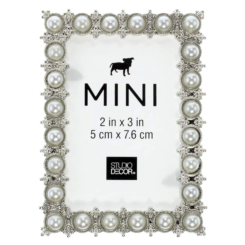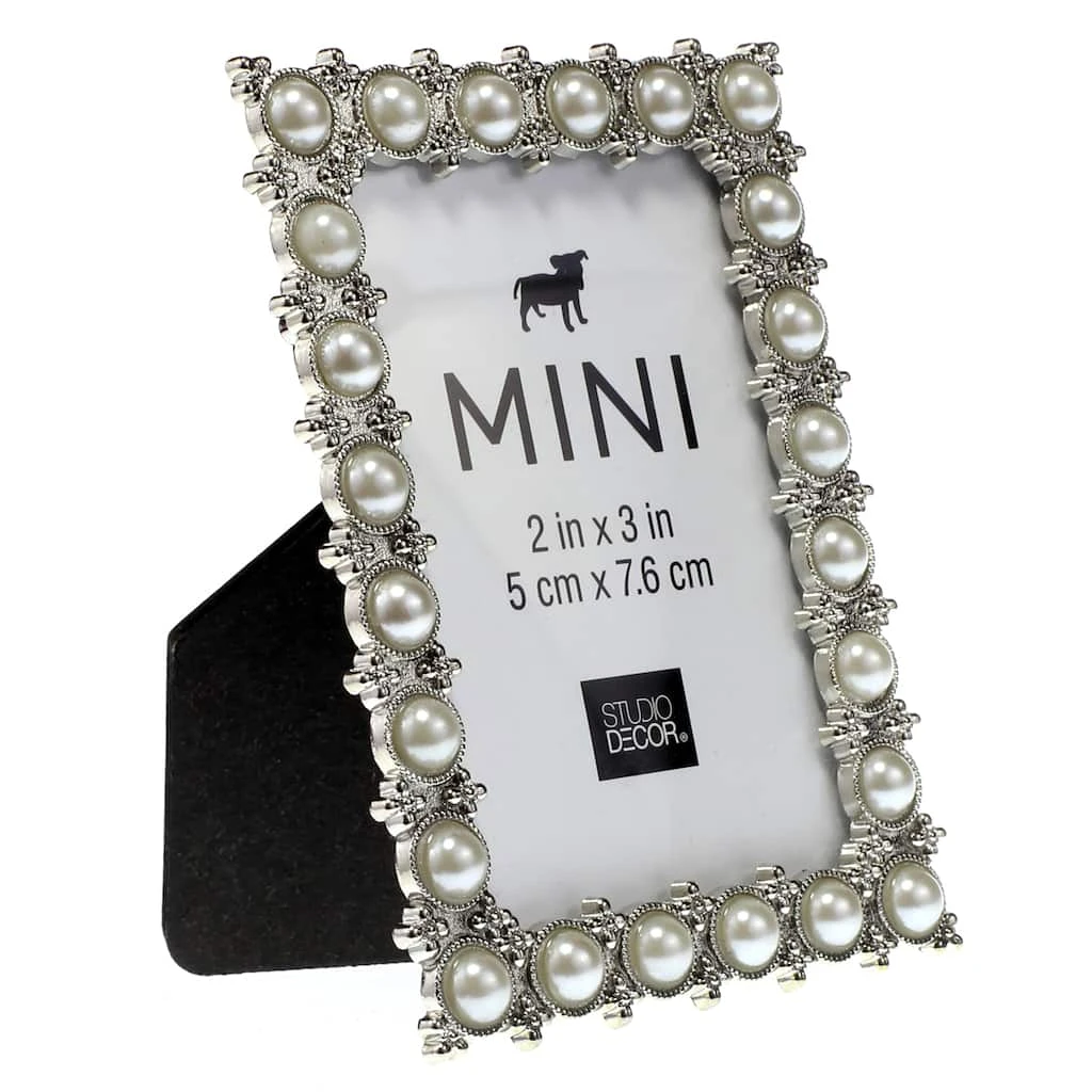 - Silver frame accented with pearls