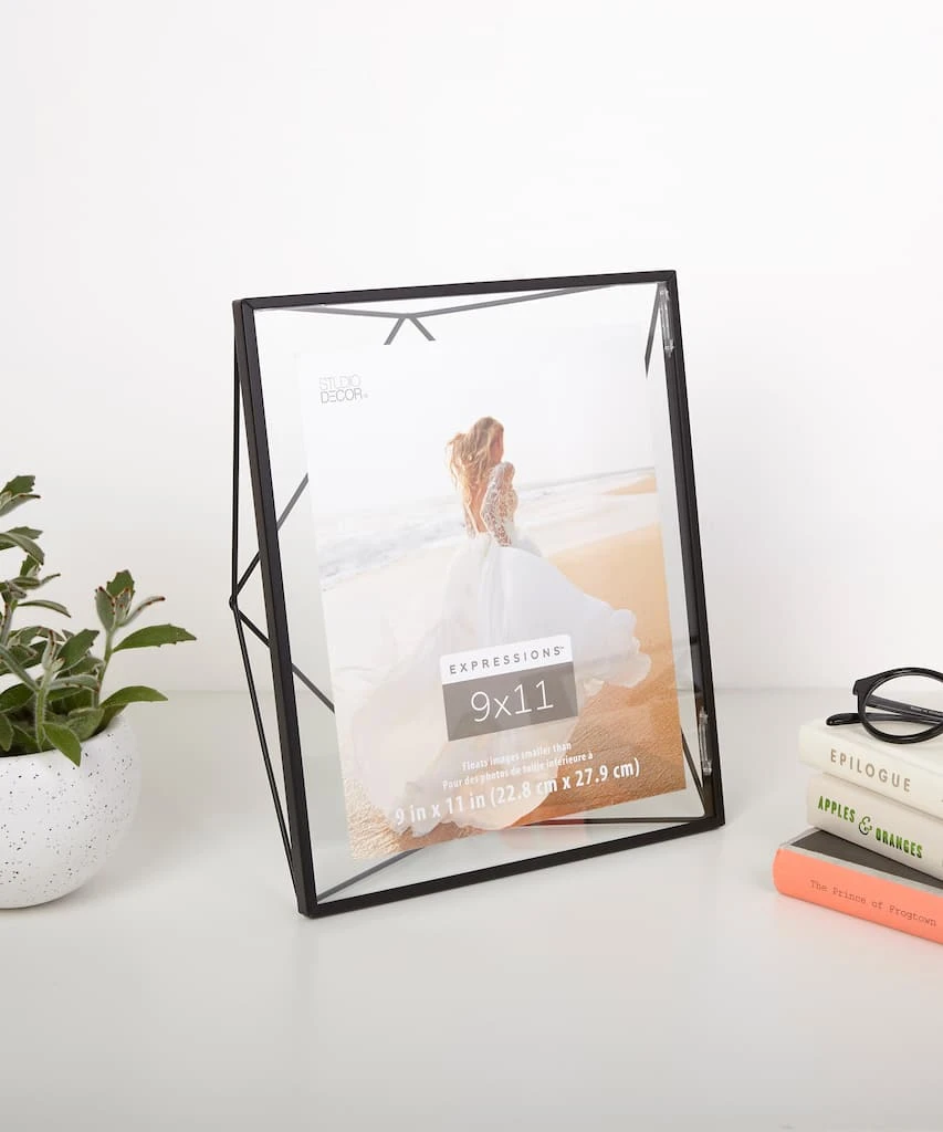 Use this black photo float frame to display your precious memories in a stylish way. Featuring a geometric design with two glass panes, it will add a unique touch to your home décor.