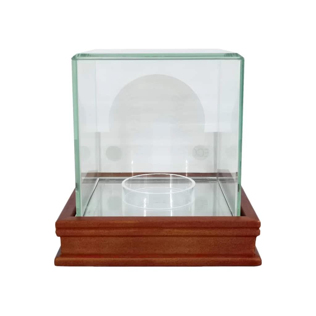 - Clear glass case with brown base